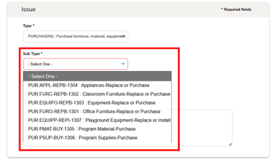 ⚠️ Note: For certain issue types, select the most relevant Sub Type* that best describes the issue. Choosing the most accurate Sub Type ensures your request is processed efficiently and routed to the correct department.
