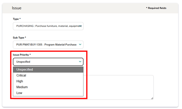 2. Issue Priority* - Select the most accurate priority based on the nature and urgency of your issue. This will ensure your request is handled appropriately.