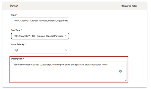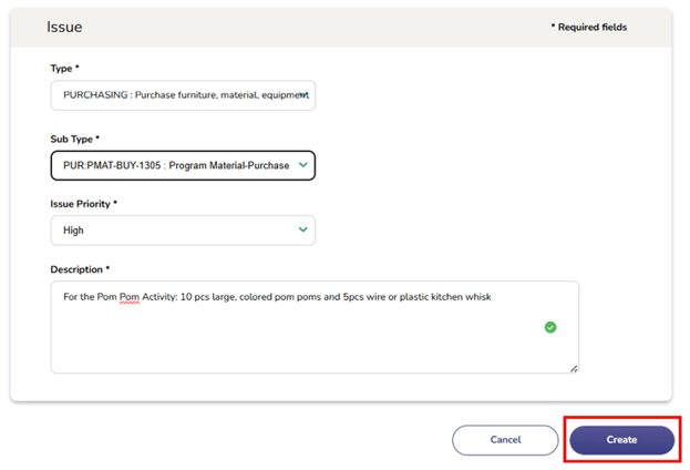 ✅ Tip: Always review your entry before clicking Create to ensure the description is clear, complete, and free of errors. A well-documented issue helps support teams respond more quickly.
