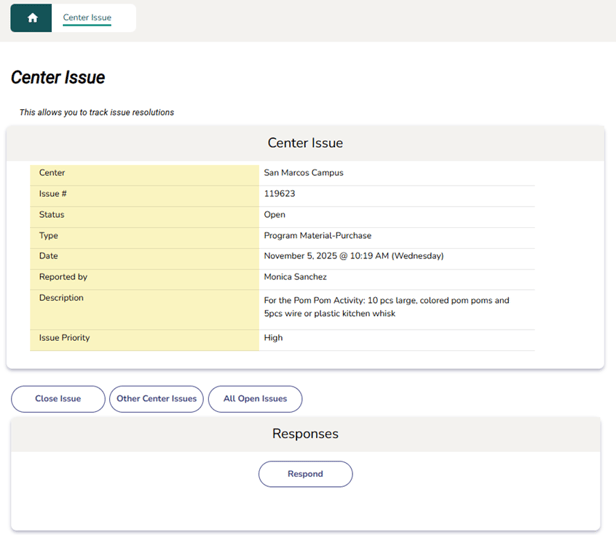 - You will be redirected to the Center Issue page, where the issue details will be displayed.