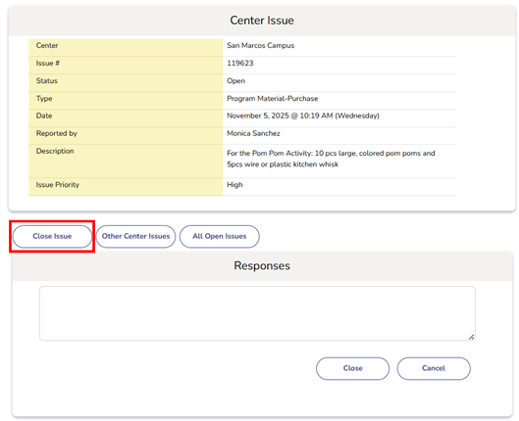 - Once closed, the issue will no longer appear in the Open Issues list.