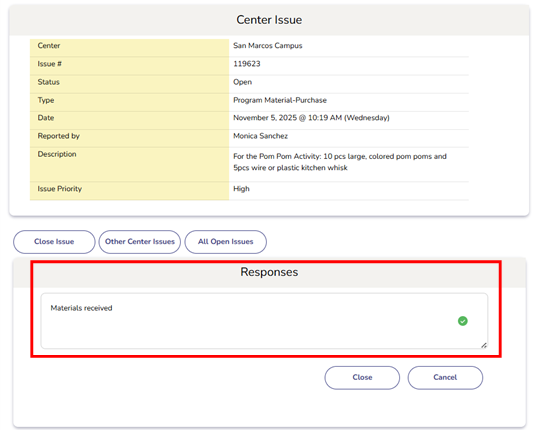 - Enter notes to track progress. When closing an issue, provide a final note explaining how it was resolved (e.g., “Materials received”).