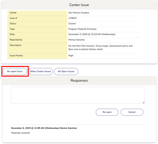 - Use this button to re-open a previously closed issue if additional follow-up is required.