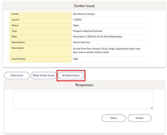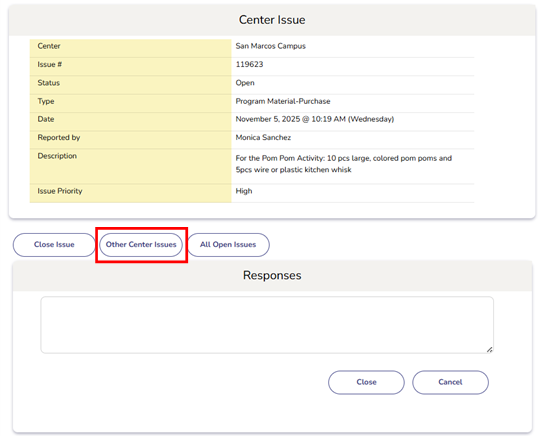 - Displays the list of all issues reported at the same center.