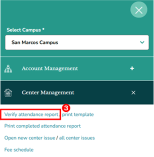 - First access the Center Management section by clicking on the hamburger menu (☰) item. See image above.