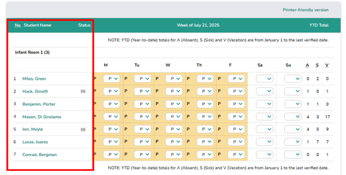 - Student List – The table is organized by classrooms. Each row represents a student with their complete name and enrollment status.