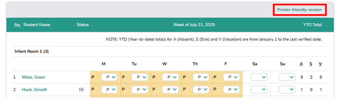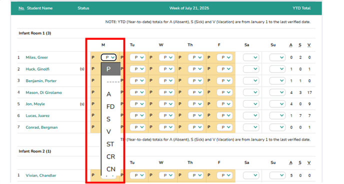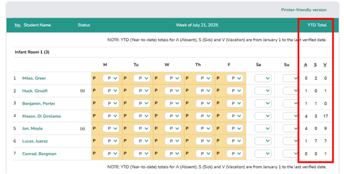 - Totals – At the right, year-to-date (YTD) totals are calculated for Absent, Sick, and Vacation. This is calculated from January 1 to the last verified date.