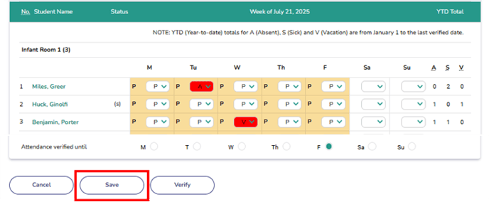 👉 Example: When attendance has been verified through Sunday, entries can no longer be edited. You may then proceed to verify the following week.
