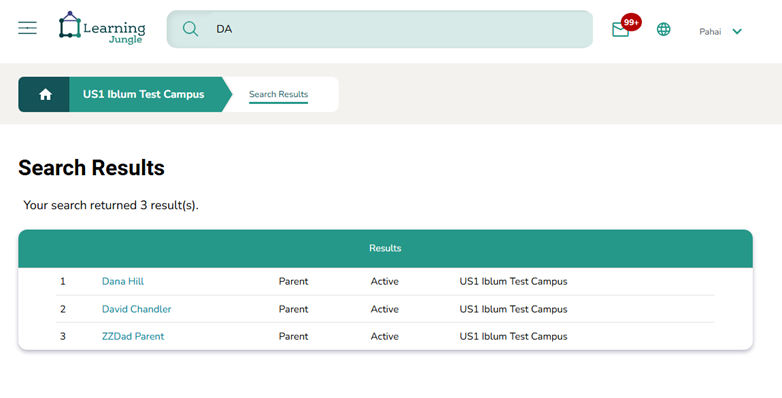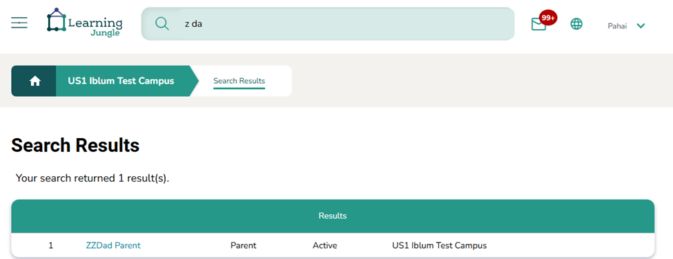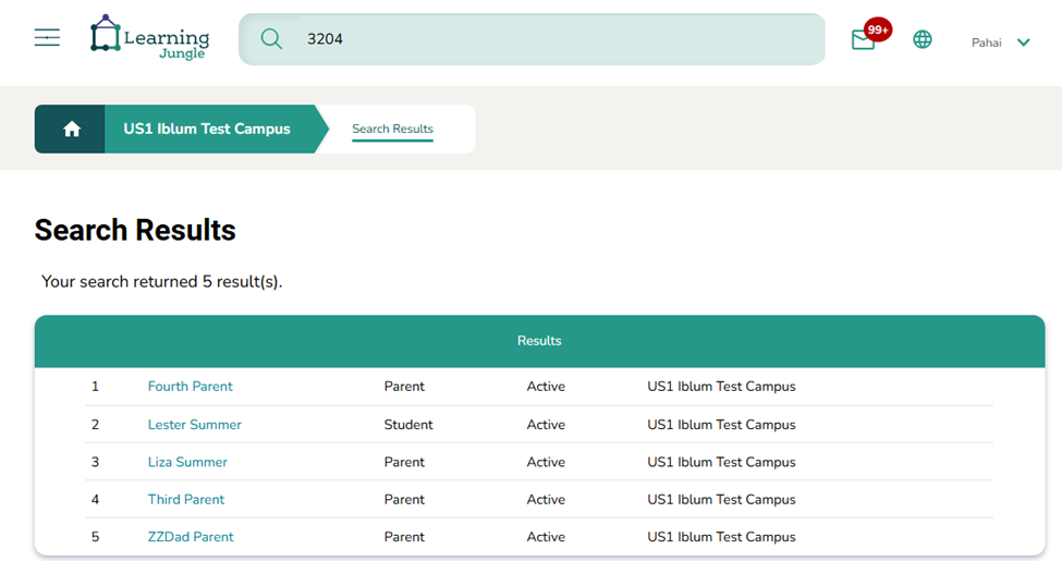 E.g. when you search for 3204, then every individual (parent, child) associated for the account with last four digits of 3204 is listed, along with their role, whether they’re active, and the name of the facility.