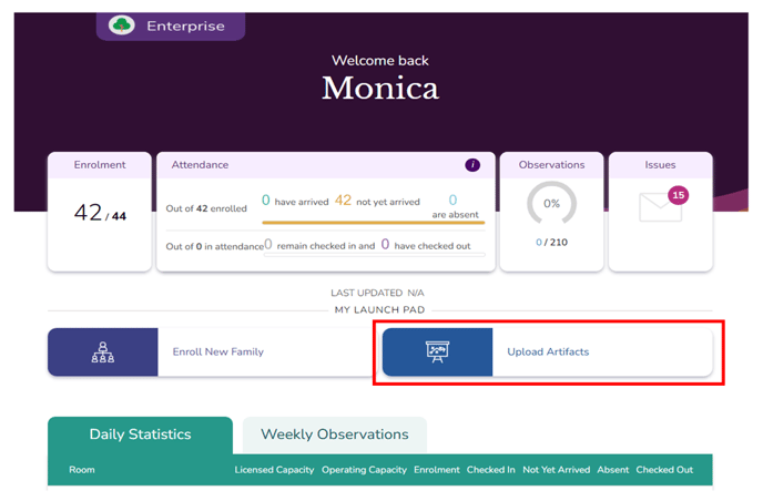 You can also access the Upload Artifacts page from the dashboard. Click Upload Artifacts as shown in the image below.