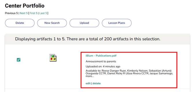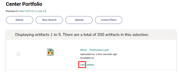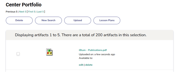 This will lead you to the "Center Portfolio" page where you will be able to see the artifacts that were uploaded.