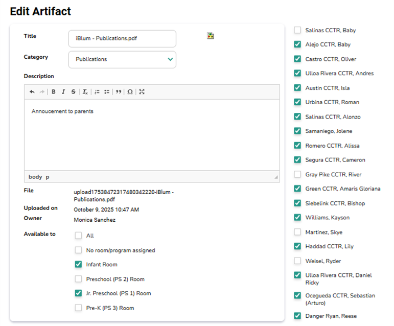 Description: Add relevant details (e.g., Announcement to parents).